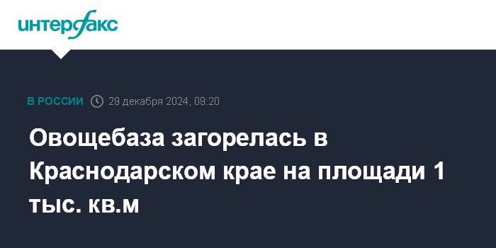 Москва. 29 декабря. INTERFAX.RU - Огонь охватил склад с овощами и фруктами в Краснодарском крае на площади 1 тыс. кв.м., сообщила пресс-служба МЧС РФ в воскресенье.