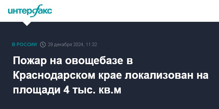 Москва. 29 декабря. INTERFAX.RU - Крупное возгорание в складском помещении с овощами и фруктами в Краснодарском крае локализовано, сообщила пресс-служба МЧС РФ в воскресенье.