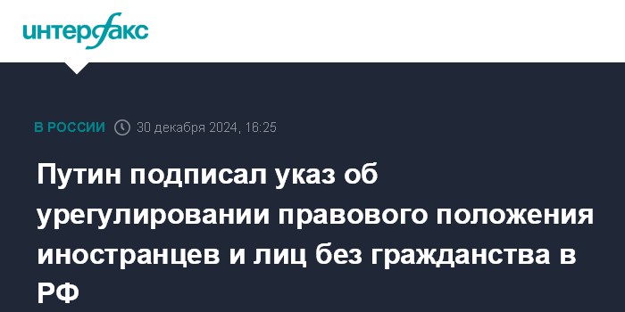 Москва. 30 декабря. INTERFAX.RU - Иностранные граждане и лица без гражданства, сведения о которых подлежат включению в реестр контролируемых лиц, обязаны самостоятельно выехать из России либо до 30 апреля 2025 года урегулировать свое правовое положение в РФ, говорится в указе президента России Владимира Путина.