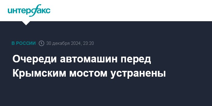Москва. 30 декабря. INTERFAX.RU - Очереди к досмотровым пунктам при въезде на Крымский мост полностью ликвидированы в понедельник вечером, сообщил телеграм-канал, освещающий ситуацию на автомобильных подходах к мосту.