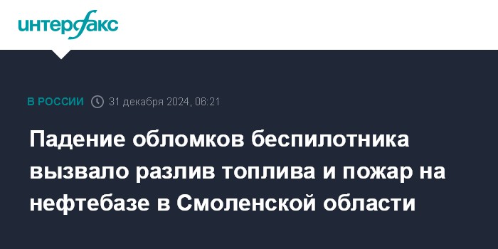 Падение обломков беспилотника вызвало разлив топлива и пожар на нефтебазе в Смоленской области