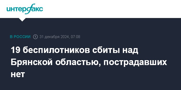 Москва. 31 декабря. INTERFAX.RU - 19 дронов были уничтожены над территорией Брянской области, сообщил губернатор региона Александр Богомаз.