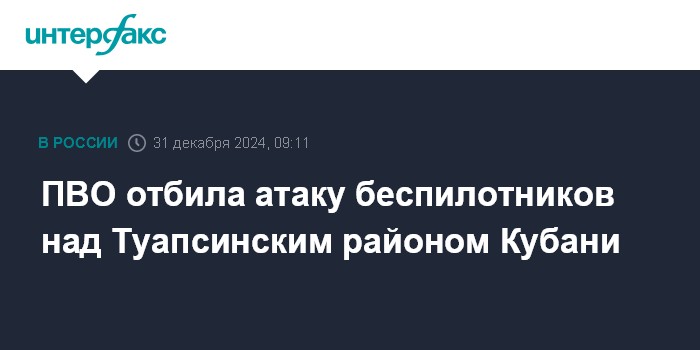 Москва. 31 декабря. INTERFAX.RU - Силами противовоздушной обороны отражена атака дронов над Туапсинским районом Краснодарского края, сообщил глава района Сергей Бойко в своем телеграм-канале.