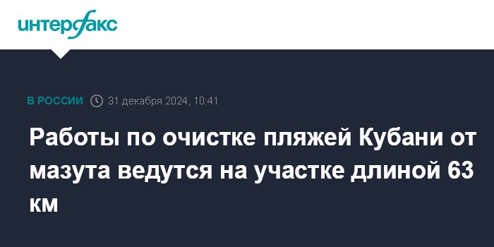 Москва. 31 декабря. INTERFAX.RU - Береговая линия пляжей Черноморского побережья Краснодарского края, загрязненного мазутом после крушения танкеров в акватории Керченского пролива, составляет уже 63 км, сообщает пресс-служба МЧС России.
