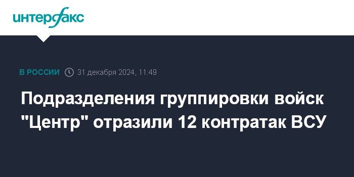 Москва. 31 декабря. INTERFAX.RU - Группировка "Центр" продвигается в глубину обороны украинской армии, отражено 12 контратак ВСУ, сообщили в Минобороны РФ во вторник.