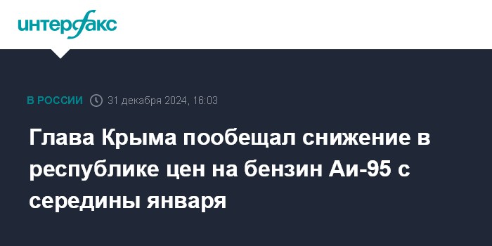 Москва. 31 декабря. INTERFAX.RU - Стоимость бензина Аи-95 снизят в Крыму с середины января почти на 3 рубля за литр в двух крупнейших сетях, сообщил во вторник глава республики Сергей Аксенов.