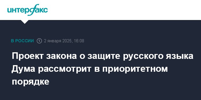 Москва. 2 января. INTERFAX.RU - Председатель Госдумы Вячеслав Володин поручил профильному комитету по культуре подготовить в приоритетном порядке к рассмотрению в первом чтении законопроект о защите русского языка, сообщили в пресс-службе палаты парламента РФ.