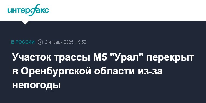 Москва. 2 января. INTERFAX.RU - Запрет на движение транспорта установлен на участке федеральной автодороги М5 "Урал" в Оренбургской области из-за метели, сообщает в четверг пресс-служба министерства сельского хозяйства, торговли, пищевой и перерабатывающей промышленности региона.