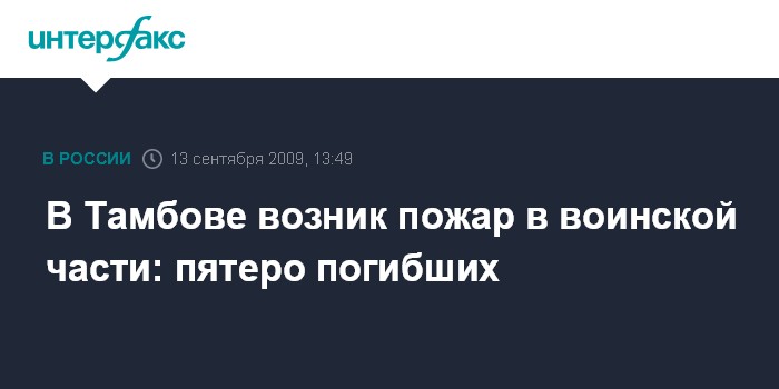 Москва. 13 сентября. INTERFAX.RU - В Тамбове в воскресенье пять человек погибли и семеро пострадали в результате пожара в штабе в/ч 57/604, сообщили "Интерфаксу" в пресс-службе управления МЧС региона.
