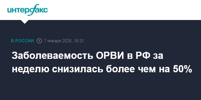 Москва. 7 января. INTERFAX.RU - Число заболевших ОРВИ в РФ за неделю снизилось более чем на 50%, всего выявлено 307,9 тыс. случаев, сообщили во вторник в Роспотребнадзоре.