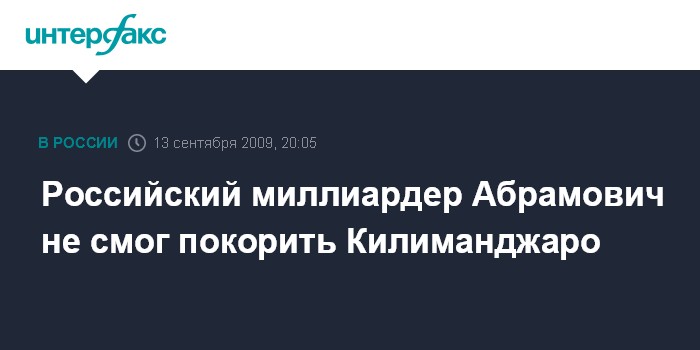Москва. 13 сентября. ИНТЕРФАКС - Попытка российского миллиардера Романа Абрамовича покорить наивысшую точку Африки - гору Килиманджаро - завершилась неудачей, сообщают в воскресенье зарубежные СМИ.