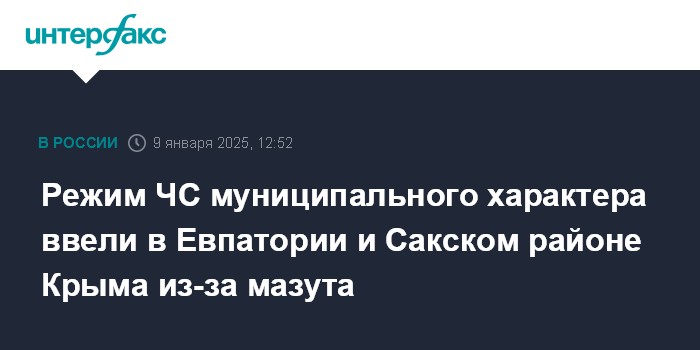 Москва. 9 января. INTERFAX.RU - Режим чрезвычайной ситуации муниципального характера введен на территории Евпатории и Сакского района Крыма из-за выбросов мазута на побережье, сообщила пресс-служба МЧС республики в четверг.