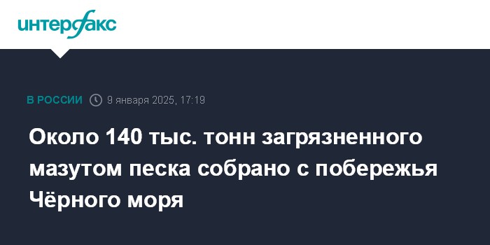 Москва. 9 января. INTERFAX.RU - С водной поверхности и береговой линии Чёрного моря группировкой более 8 тысяч человек собрано около 140 тысяч тонн мазута с песком, сообщил глава МЧС России Александр Куренков.