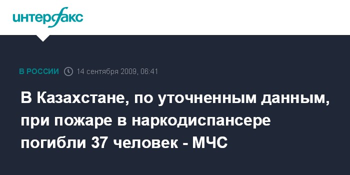 Астана. 14 сентября. ИНТЕРФАКС-КАЗАХСТАН - По уточненным данным, пожар в наркологическом диспансере в Талдыкоргане (адмцентр Алматинской области Казахстана) унес жизни 37 человек, еще 14 пострадали, сообщает МЧС Казахстана в понедельник.