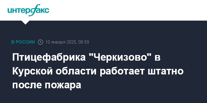 Москва. 10 января. INTERFAX.RU - АО "Куриное царство" (входит в ГК "Черкизово") в Курской области работает в штатном режиме после пожара, произошедшего накануне на одной из производственных площадок, сообщила ГК.