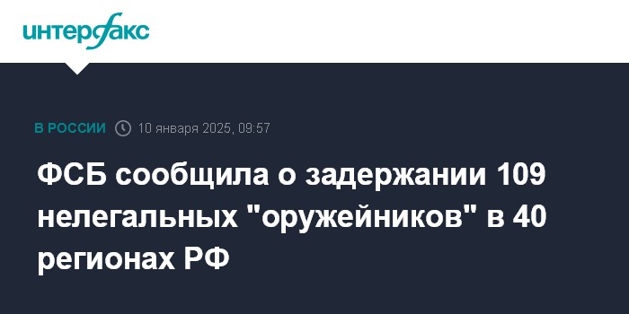 Москва. 10 января. INTERFAX.RU - В ФСБ сообщили о задержании 109 человек, причастных к незаконному обороту оружия в 40 субъектах РФ, прекращена работа 38 подпольных мастерских по переделке оружия.