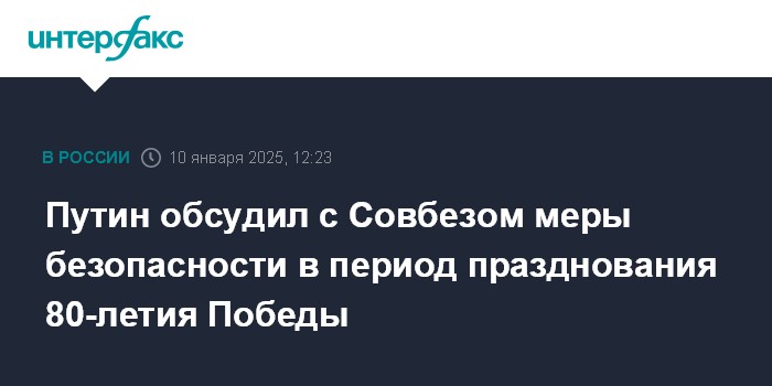 Москва. 10 января. INTERFAX.RU - Президент РФ Владимир Путин обсудил с постоянными членами Совбеза РФ дополнительные меры по обеспечению общественной безопасности в период подготовки и проведения празднования 80-й годовщины Победы в Великой Отечественной войне.