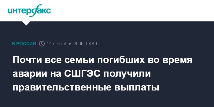Москва. 14 сентября. INTERFAX.RU - Выплата компенсаций из резервного фонда правительства РФ семьям погибших в результате аварии на Саяно-Шушенской ГЭС завершится 15 сентября. По сообщению пресс-службы правительства Хакасии, на утро понедельника родственникам погибших было перечислено 73 млн 660 тыс. рублей.