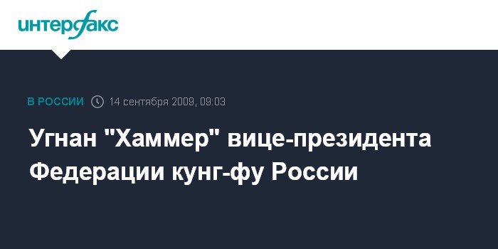 Москва. 14 сентября. INTERFAX.RU - У вице-президента Федерации кунг-фу России на юге столицы угнали принадлежащий ему автомобиль "Хаммер H2", сообщил "Интерфаксу" в понедельник источник в правоохранительных органах столицы. Он рассказал, что 36-летний спортивный чиновник обратился в милицию накануне около 11:30 и сообщил, что неизвестные в период с 19:30 субботы до 11:00 воскресенья угнали принадлежащий ему автомобиль, который был припаркован около дома на ул. Генерала Белова. "Ущерб мужчина оценил примерно в 2 млн рублей", - рассказал собеседник агентства.