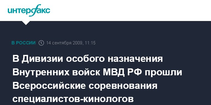 В сообщении пресс-службы ДепУР, поступившем в "Интерфакс" в понедельник говорится, что в Дивизии особого назначения Внутренних войск МВД России прошли межведомственные Всероссийские соревнования специалистов-кинологов органов безопасности и правопорядка со служебными собаками.