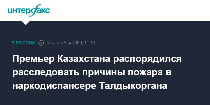 Москва. 14 сентября. INTERFAX.RU - Специальным постановлением премьер-министра Казахстана Карима Масимова сформирована правительственная комиссия в целях оказания помощи семьям погибших и ликвидации последствий пожара, произошедшего в наркодиспансере Талдыкоргана (адмцентр Алматинской области). Как сообщила пресс-служба премьер-министра, правительственную комиссию возглавил вице-премьер Серик Ахметов, в ее состав, в частности, вошли министр по чрезвычайным ситуациям Владимир Божко, руководители министерств здравоохранения, труда и социальной защиты, правоохранительных органов, аким Алматинской области.