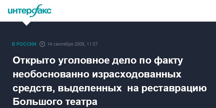 Москва. 14 сентября. INTERFAX.RU - СКП РФ возбудило уголовное дело по факту необоснованно израсходованных средств, выделенных на реставрацию Большого театра России. Как сообщил "Интерфаксу" официальный представитель СКП РФ Владимир Маркин в понедельник, уголовное дело возбуждено по статье 285 УК РФ