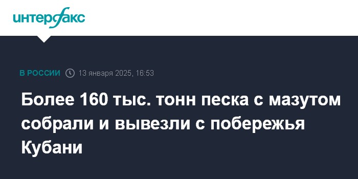 Москва. 13 января. INTERFAX.RU - Спасатели и волонтеры собрали с побережья города-курорта Анапы и Темрюкского района Краснодарского края более 160 тыс. тонн песка с мазутом, сообщает пресс-служба МЧС России.