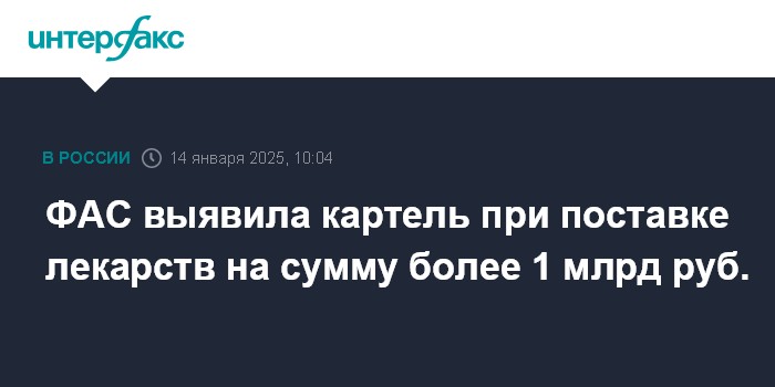 Москва. 14 января. INTERFAX.RU - Федеральная антимонопольная служба выявила картель при поставке лекарственных препаратов на сумму свыше 1 млрд рублей, в отношении двух компаний возбуждено дело о нарушении антимонопольного законодательства, сообщили в службе.