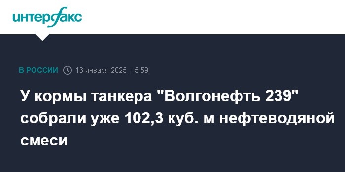 Москва. 16 января. INTERFAX.RU - С 10 января у кормы затонувшего танкера "Волгонефть 239" собрали 102,3 куб. м нефтеводяной смеси, сообщил телеграм-канал Морспасслужбы.