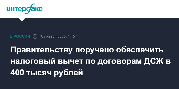 Москва. 16 января. INTERFAX.RU - Президент Владимир Путин поручил правительству до 1 марта 2025 года законодательно закрепить увеличение налогового вычета по договорам долевого страхования жизни (ДСЖ) и иным долгосрочным договорам страхования жизни до уровня налогового вычета по договорам долгосрочных сбережений (то есть до 400 тысяч рублей в год), сообщает сайт Кремля.