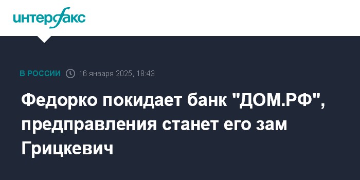 Москва. 16 января. INTERFAX.RU - Артем Федорко с 16 января покидает пост председателя правления банка "ДОМ.РФ", правление возглавит Максим Грицкевич, занимавший пост зампреда кредитной организации, сообщил банк.