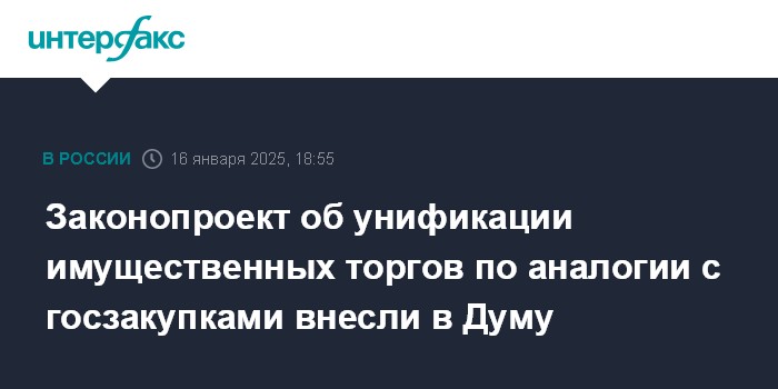 Москва. 16 января. INTERFAX.RU - Правительство внесло в Госдуму законопроект об унификации имущественных торгов по аналогии с госзакупками, который в четверг был одобрен на заседании правительства. Документ № 819547-8 размещен думской базе.