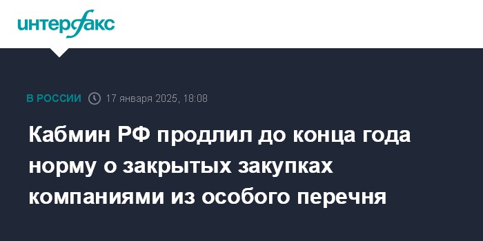 Москва. 17 января. INTERFAX.RU - Правительство РФ продлило до конца 2025 года норму о проведении юрлицами из особого перечня своих закупок в закрытом режиме. Соответствующее правительственное постановление опубликовано на портале правовой информации.