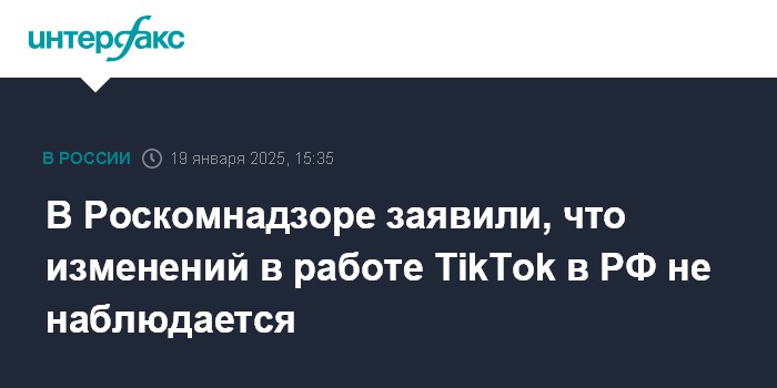 Москва. 19 января. INTERFAX.RU - Роскомнадзор (РКН) не фиксирует каких-либо изменений в работе TikTok при использовании сервиса в России, сообщила "Интерфаксу" пресс-служба ведомства.