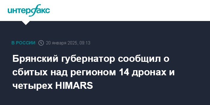 Москва. 20 января. INTERFAX.RU - Над Брянской область за ночь ПВО сбила четыре ракеты HIMARS и 14 БПЛА самолетного типа, сообщил глава региона Александр Богомаз.