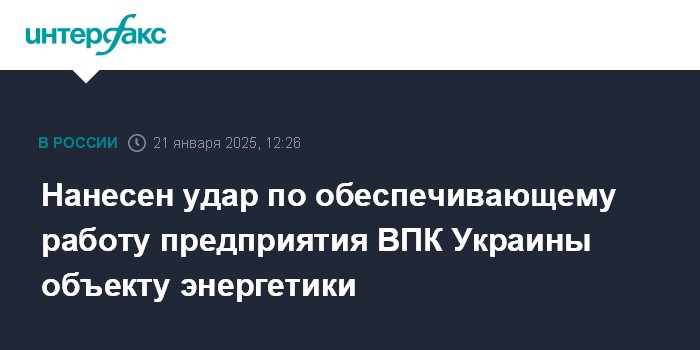 Москва. 21 января. INTERFAX.RU - Российские военные сообщили, что нанесли поражение объекту энергетики, обеспечивающему работу предприятия военно-промышленного комплекса Украины.