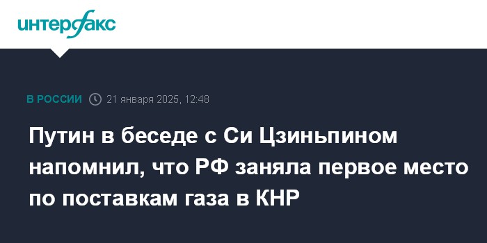 Москва. 21 января. INTERFAX.RU - Россия заняла первое место по поставкам в Китай природного газа, отметил президент России Владимир Путин в беседе с председателем КНР Си Цзиньпином.
