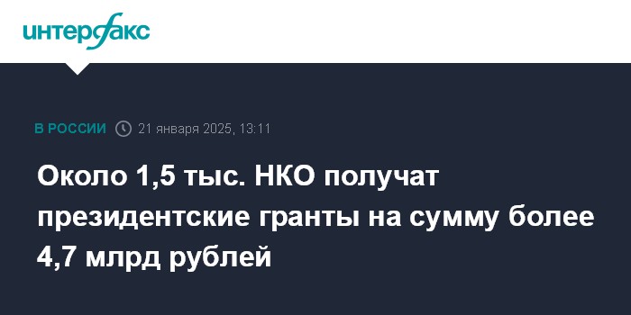 Москва. 21 января. INTERFAX.RU - Определены победители первого в 2025 году конкурса Фонда президентских грантов - ими стали около 1,5 тыс. некоммерческих организаций (НКО); они получат гранты на сумму свыше 4,7 млрд рублей, сообщили в фонде.