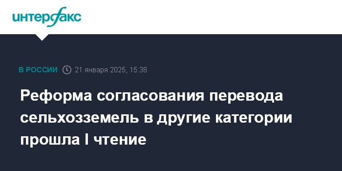 Москва. 21 января. INTERFAX.RU - Госдума приняла в первом чтении законопроект о введении обязательного согласования с Минсельхозом перевода земель сельскохозяйственного назначения в другие категории.