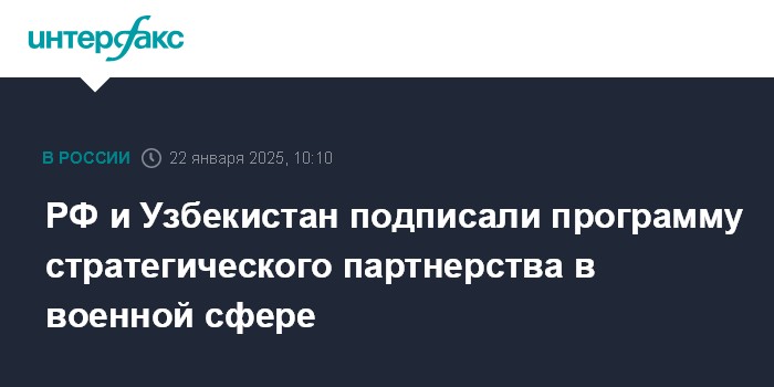 Москва. 22 января. INTERFAX.RU - План сотрудничества между министерствами обороны России и Узбекистана на 2025 год и программа стратегического партнерства между двумя странами в военной области на 2026-2030 годы подписаны в среду в Ташкенте.