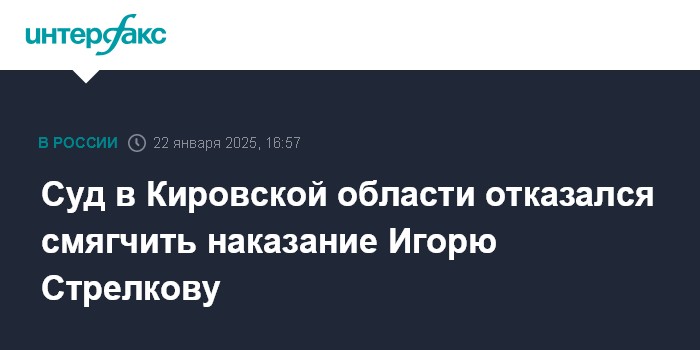 Москва. 22 января. INTERFAX.RU - Кирово-Чепецкий районный суд Кировской области отказал в удовлетворении ходатайства о замене неотбытой части лишения свободы более мягким видом наказания одному из бывших лидеров донецкого ополчения Игорю Стрелкову (Гиркину), осужденному на четыре года колонии общего режима по уголовному делу о призывах к экстремистской деятельности.