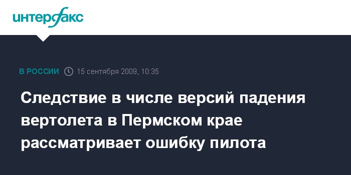 Москва. 15 сентября. INTERFAX.RU - В Пермском крае расследуют обстоятельства крушения прогулочного двухместного вертолета фирмы "Робинсон" в минувший понедельник. "Есть три основных версии - отказ техники, ошибка пилота и воздействие внешних сил. Версия теракта исключается", - сообщил агентству "Интерфакс-Поволжье" руководитель пермского межрайонного следственного отдела Уральского следственного управления на транспорте СКП РФ Ильдар Салахиев во вторник.