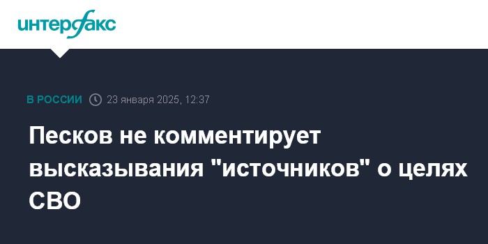 Москва. 23 января. INTERFAX.RU - Пресс-секретарь президента России Дмитрий Песков не стал комментировать утверждения источников Reuters о том, что Владимир Путин уже считает достигнутыми цели СВО.
