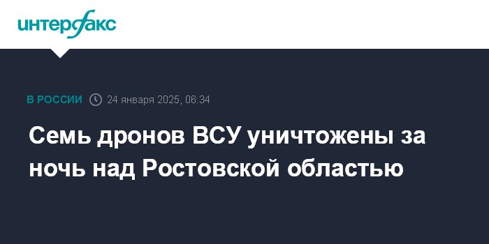 Москва. 24 января. INTERFAX.RU - Губернатор Ростовской области Юрий Слюсарь сообщил о ликвидации семи украинских беспилотников над территорией региона.