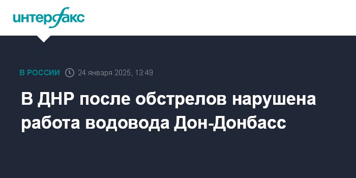 Москва. 24 января. INTERFAX.RU - В Донецкой народной республике из-за обстрелов нарушена работа водовода Дон-Донбасс, подача воды сокращена на 20%, сообщили в Минстрое ДНР.