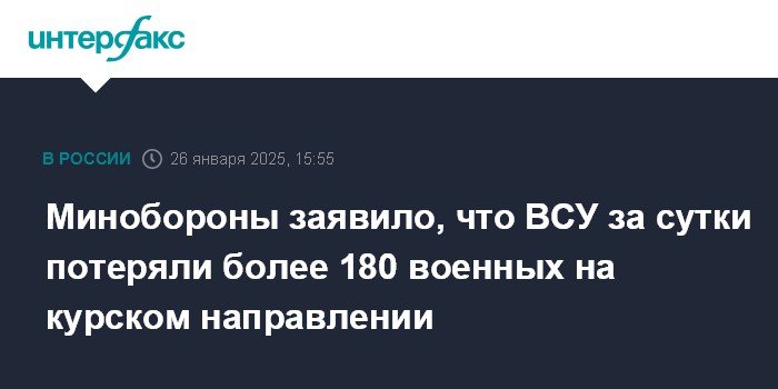 Москва. 26 января. INTERFAX.RU - Потери украинских войск на курском направлении за минувшие сутки составили свыше 180 военных, сообщило Минобороны РФ в воскресенье.