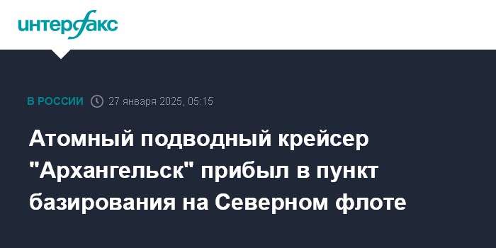 Москва. 27 января. INTERFAX.RU - Новая атомная подводная лодка "Архангельск" прибыла в пункт базирования на Северном флоте, сообщила пресс-служба Северного флота.
