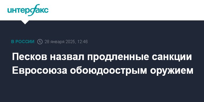 Москва. 28 января. INTERFAX.RU - Продленные санкции Евросоюза против России - это обоюдоострое оружие, заявил на брифинге пресс-секретарь президента Дмитрий Песков.