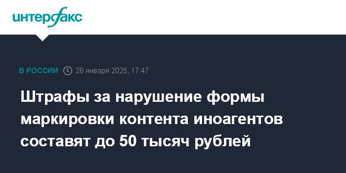 Штрафы за нарушение формы маркировки контента иноагентов составят до 50 тысяч рублей