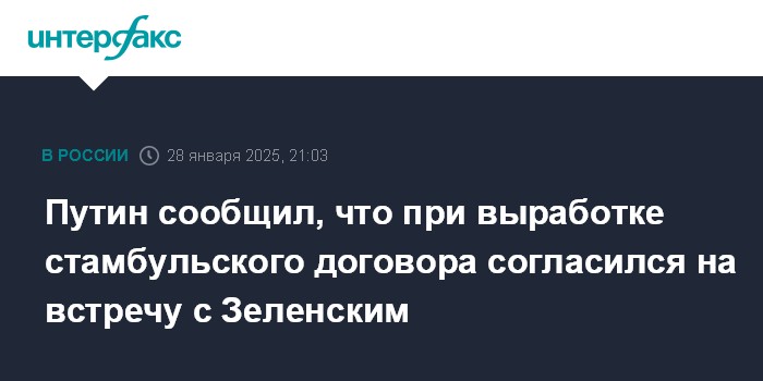 Москва. 28 января. INTERFAX.RU - Президент РФ Владимир Путин заявил, что в процессе выработки стамбульских договоренностей дал согласие на встречу с президентом Украины Владимиром Зеленским для их фиксации.